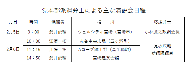 自民党候補者の主な演説会等を順次更新します。自民党公認候補者1区 武井俊輔(元職4期)2区 江藤 拓(前職8期)3区 古川禎久(前職8期)